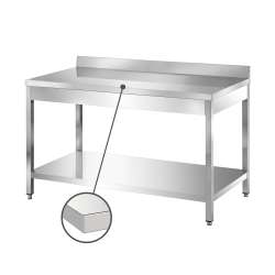 Table ouverte démontée - avec dosseret avec étagère - dessus inox 12/10ème H 4 cm P 70 cm H 90 cm - 4 pieds tube carré 40 x 40 mm (décalage des pieds arrière de 10 cm) - Fabrication AISI 304